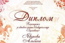 Творческий коллектив нашего детского сада не останавливается на достигнутых успехах. Активные инициаторы -педагоги участвуют в различных конкурсах авторских разработок и разнообразной творческой деятельности районного, республиканского и Всероссийского уровнях. Заместитель заведующего по воспитательной и методической работе нашего детского сада Якупова Альбина Шавкатовна на днях была награждена ДИПЛОМОМ Всероссийского образовательного проекта "RAZVITUM" Всероссийского сезонного конкурса 2012-2013г. изобразительного искусства за активное участие в конкурсном туре "Вдохновение".