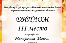 Наша воспитанница Миннуллина Айзиля участвовала в Республиканском конкурсе "Мгновения осени" для детей с ограниченными возможностями здоровья и заняла 3 место., руководитель Гумерова Р.Ф.