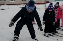 Ребята новую забаву придумали, стали со снежной горки на лыжах кататься.
