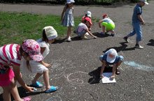 Менә бүген өлкән төркем балалары тәрбиячеләре Басырова В.М. белән асфальтта рәсемнәр ясадылар. Балалар чын рәссамнар шикелле асфальтка сурәт төшерделәр. Рәсемнәре берсеннән-берсе матур иде.