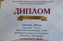 15 мая в Казанском национальном исследовательском технологическом университете прошел конкурс «Нобелевские надежды КНИТУ - 2018». В номинации «Математика» (7 классы) 2 место заняла Садыкова Аделия (руководитель Гарафутдинова Л.А.). Минвалиева Илюза и Фатыхова Алиса награждены сертификатами за активное участие. Ляля Абдулловна была отмечена благодарственным письмом. Поздравляем!
