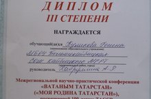 Победителем Межрегиональной научно-практической конференции «Ватаным Татарстан», посвященной 100-летию ТАССР и дополнительного образования, стала ученица 11 класса Куликова Регина. Конференция прошла 13 апреля в г.Казань. Она была очень представительной, в ней участвовали ребята и педагоги из соседних Чувашской и Марийской республик. Много интересного и нового узнали для себя Регина и ее наставник Альбина Рашитовна.