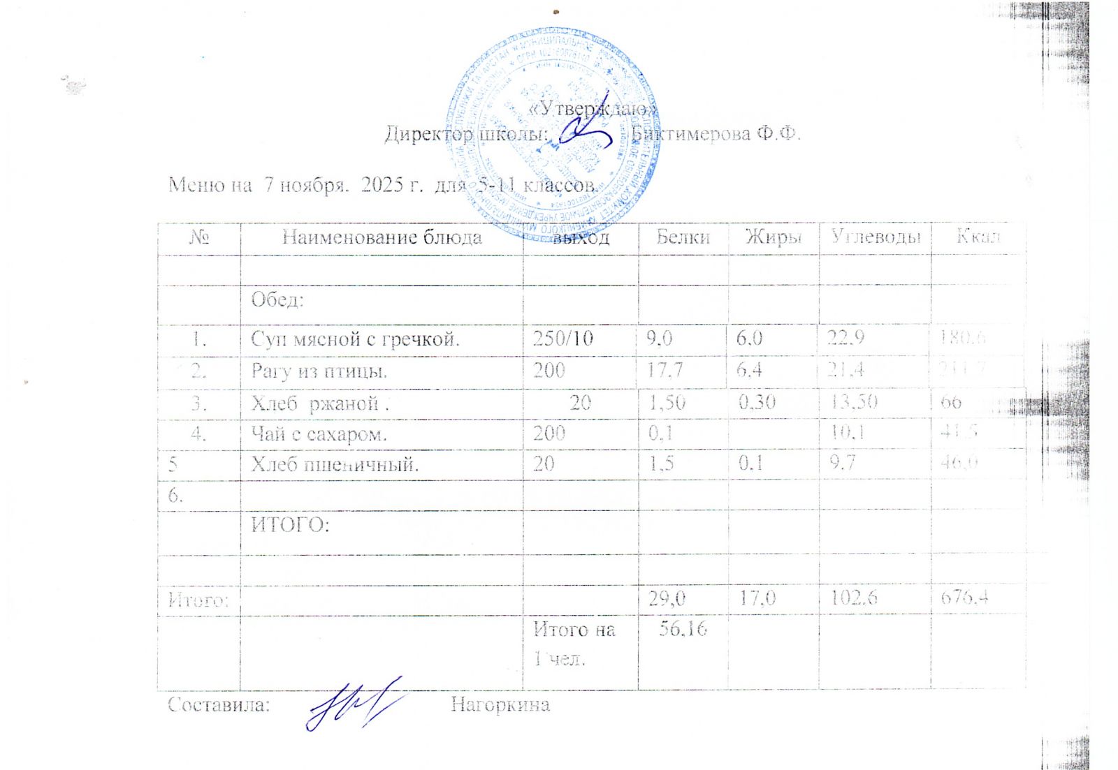 Меню Ноябрь 2025года