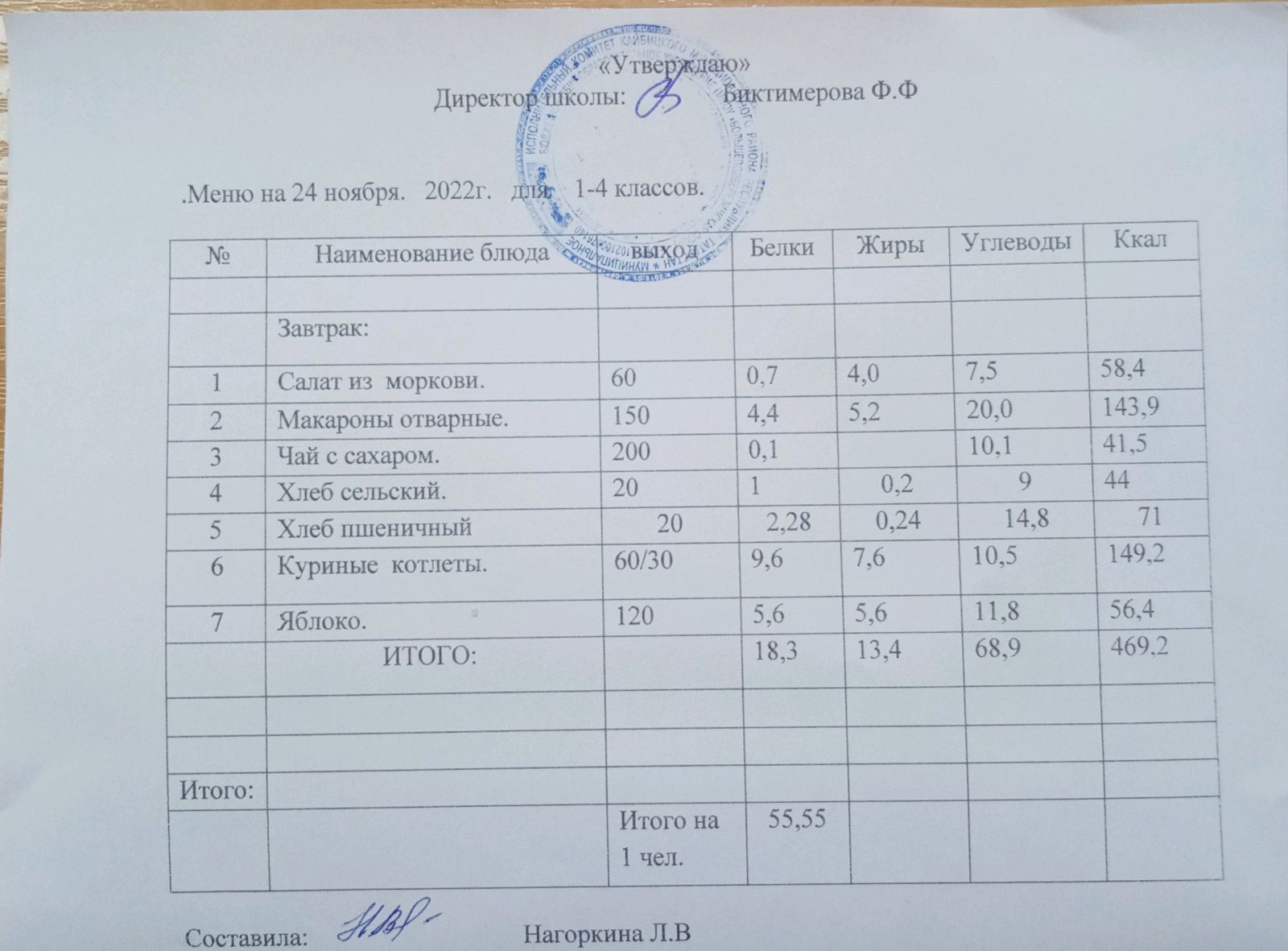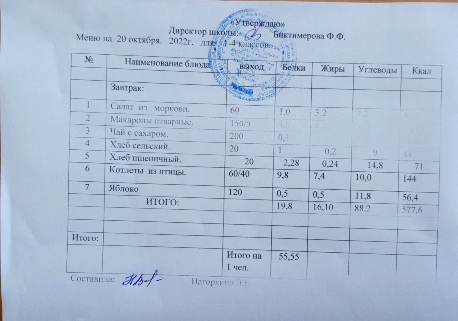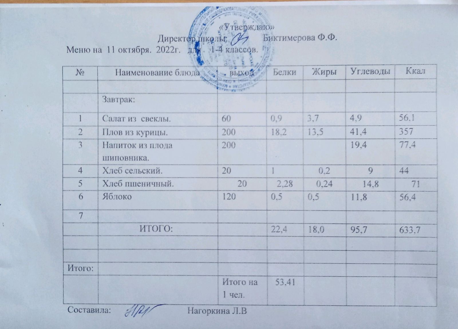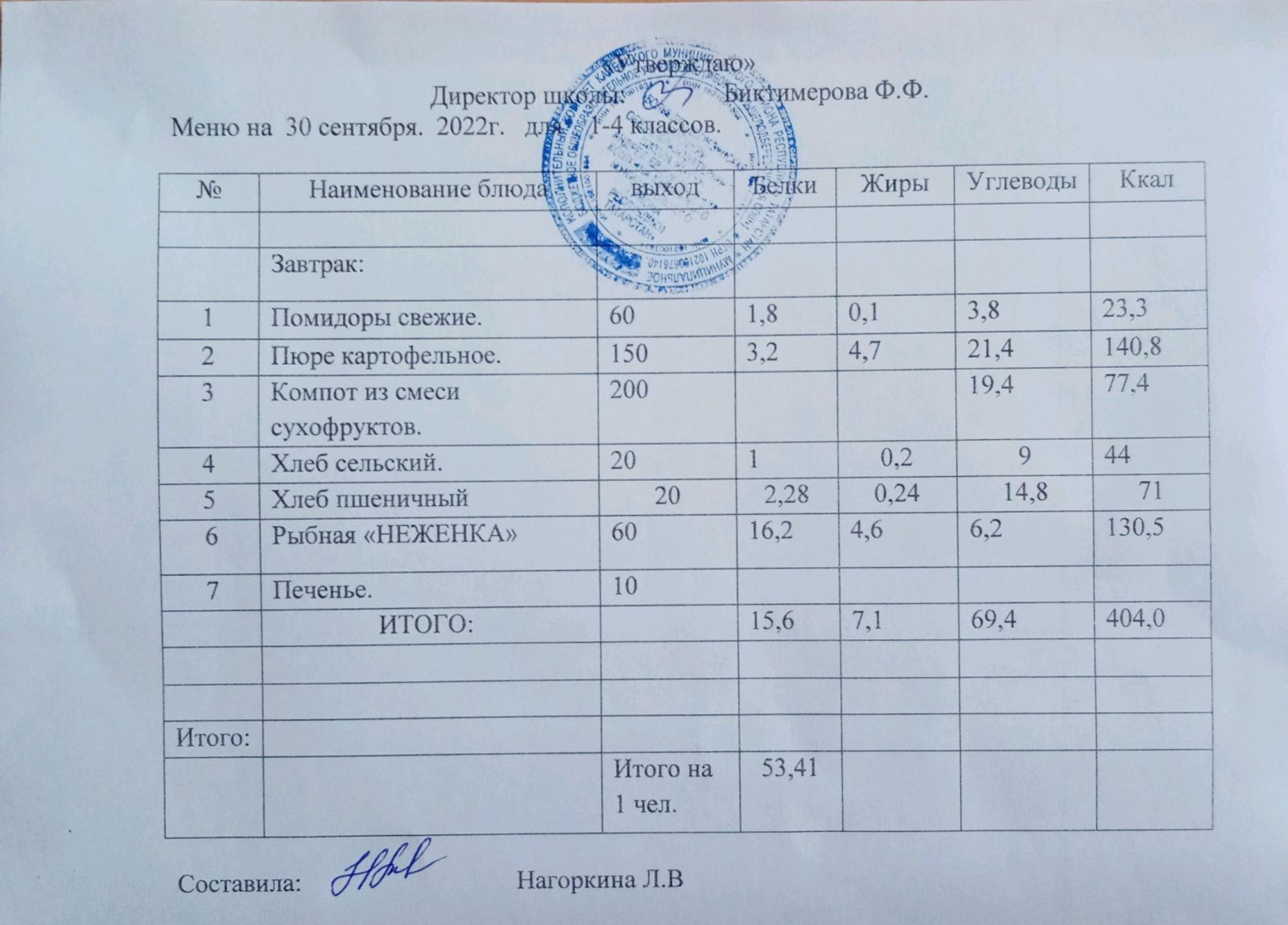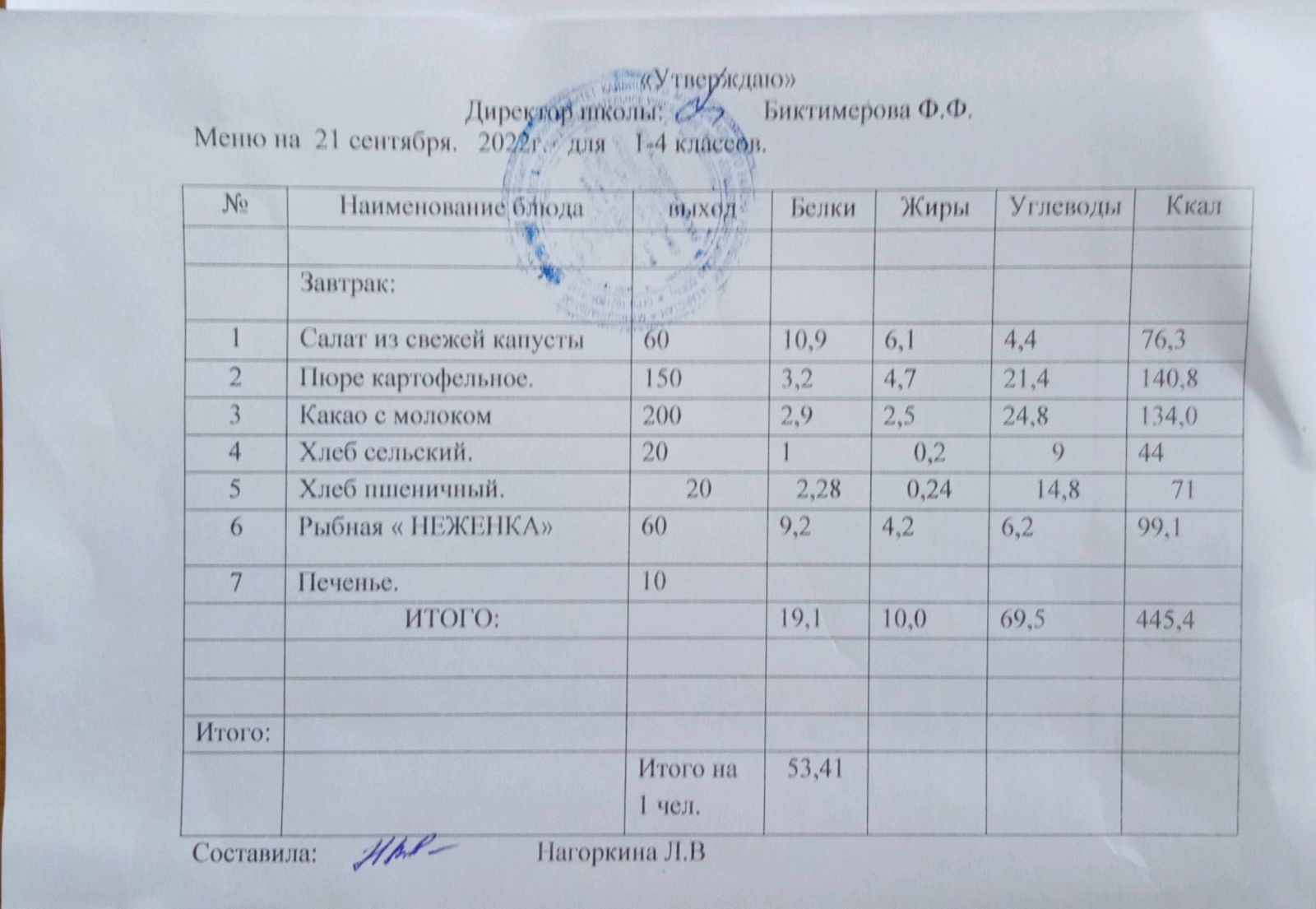 Ежедневное меню, 1-4 классы