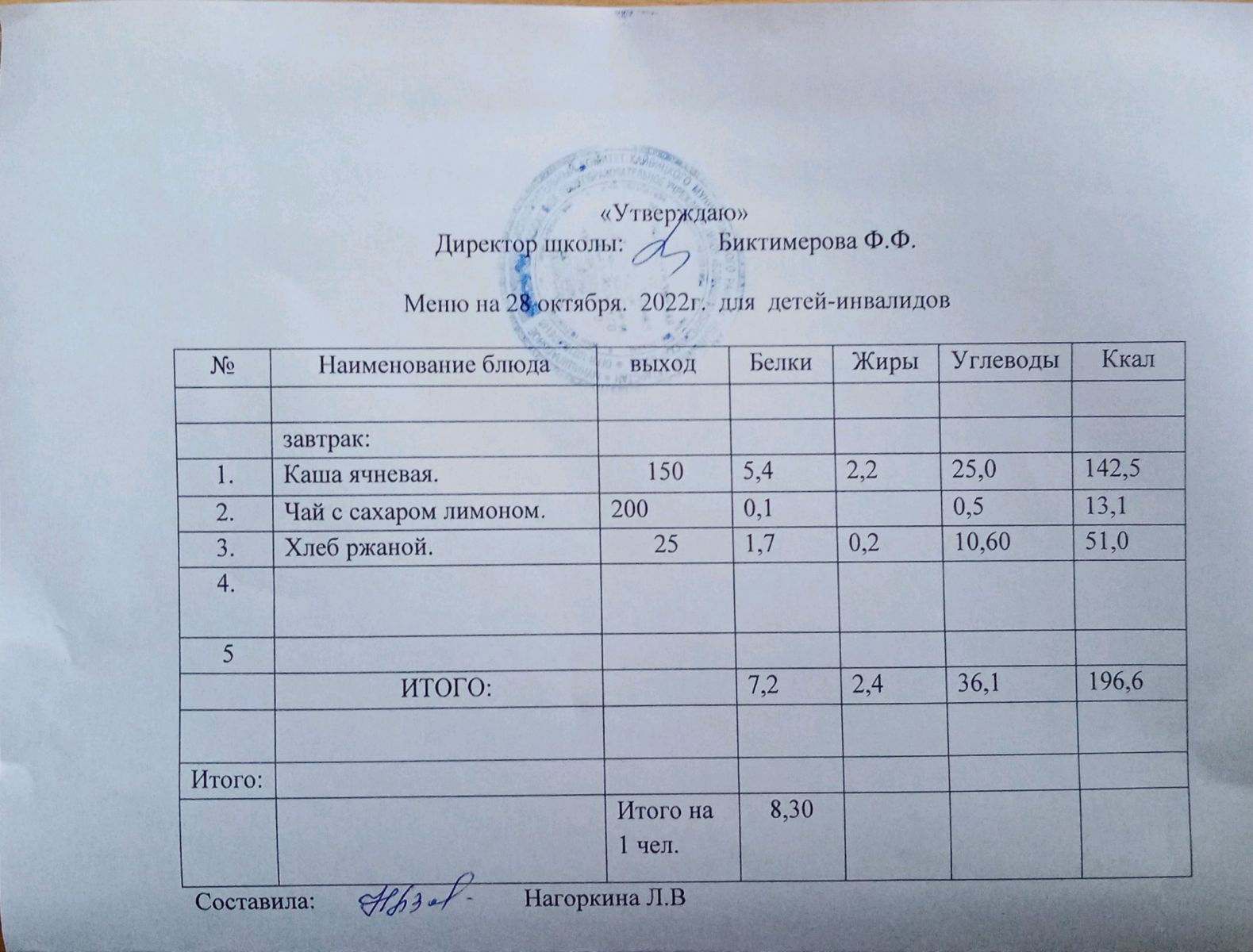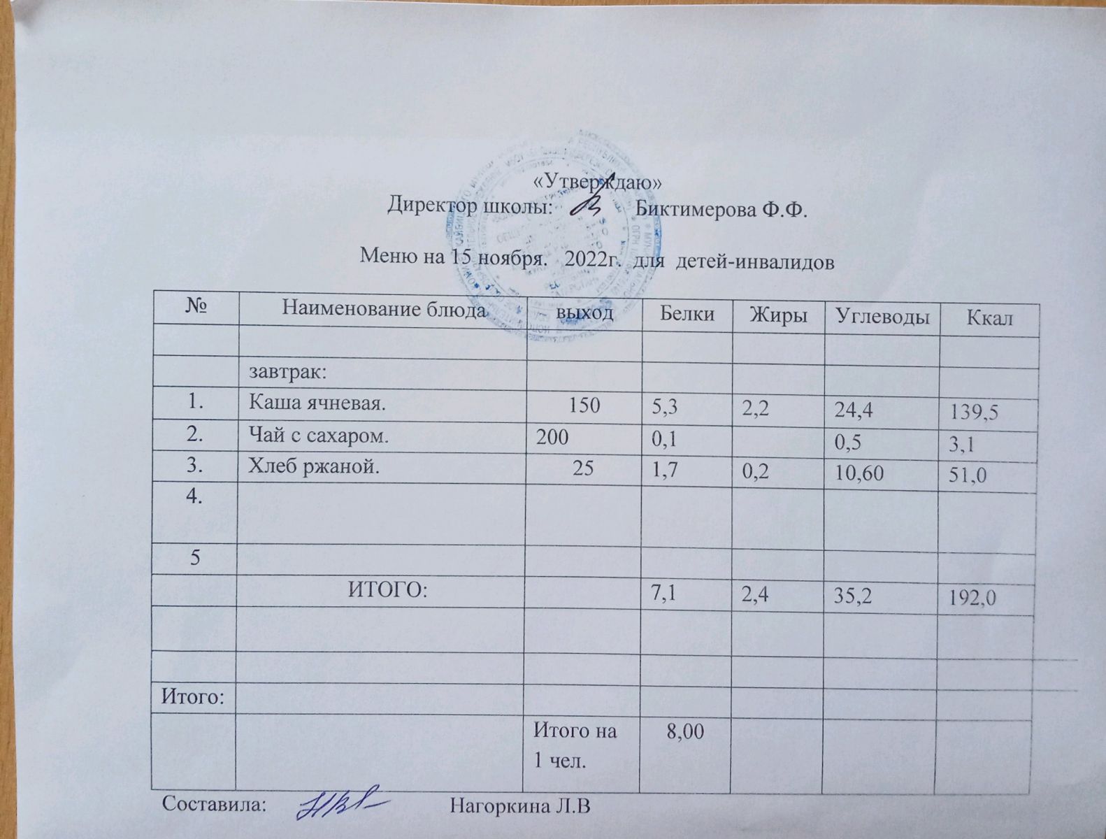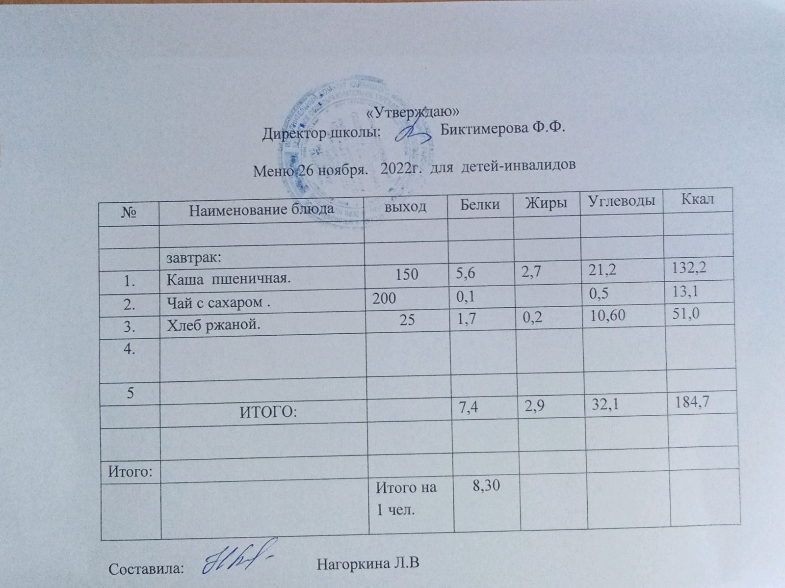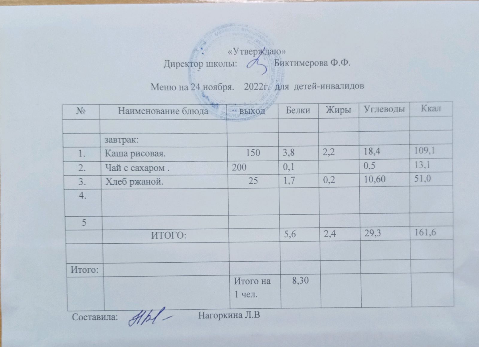 Меню для детей-инвалидов