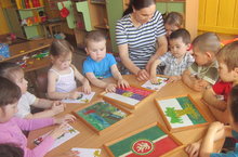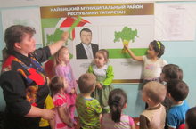 Балалар белән " Туган ягым син, Кайбычым" темасына әңгәмә үткәрдек. Белемнәрен ныгыттык, герб, флаг, гимн турында сөйләдек.