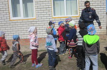 Бакчабызга бүген Кайбыч полиция бүлеге хезмәткәрләре Тимуршин Фирдүс Рәшит улы һәм Ахметов Илфат Фәрит улы килделәр. Алар балалар белән урамда, юлда йөрү кагыйдәләре буенча әңгәмә үткәрделәр.