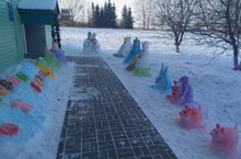 Ежегодно сотрудники детского сада строят целый снежный город. Яркие, забавные, большие фигуры гордо украшают территорию детского сада. Детям очень нравится гулять на зимнем участке, а с постройками вдвойне интереснее.