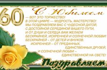 Года — это богатство, а возраст — пьедестал. Лишь победители стоят на нём. Всем нам всегда 18. А 60 лет — это сумма добрых дел, ума, порядочности, совести, рассудка, веселых дней, друзей, приключений, родных и творческих удач. С юбилеем! Почет и уважение! Желаем достойно наслаждаться каждой минутой своей жизни, на славу отдыхать, передавать свою мудрость и знания последующим поколениям, верить в свои силы, не переставать мечтать, удивлять. Благих вестей и крепкого здоровья.