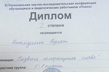 В XI Региональной научно-исследовательской конференции обучающихсяи педагогических работников "Поиск" ученик 7 класса Бикмуллин Б.(учитель Бикмуллина М.Г.) награжден Дипломом 1 степени в номинации "Подвига немеркнущая слава".