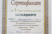 Кайбычта «Уңыш» бәйрәме - район мәктәпләре катнашында көзге ярминкә узды. Безнең коллектив бик яхшы әзерлек күрсәтте, сәүдә-күргәзмә урынын матур итеп бизәделәр. Киштәләрдә яшелчә, консервланган кыяр һәм помидор, салатлар, тоз, кайнатмалар, төрле камыр ризыклары күп иде. Без «Җәй тәме» номинациясендә җиңүче һәм өч мең сумлык сертификат ия булдык.