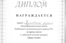 МБОУ "Чутеевская СОШ Кайбицкого муниципального района РТ" была награждена дипломом за третье место в районной осенней ярмарке " Дары осени".