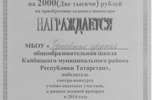 По итогам смотра-конкурса учебно-опытных участков в рамках осенней ярмарки в 2014 году наша школа была награждена сертификатом на 2000 (две тысячи) рублей на приобретение садового инвентаря.