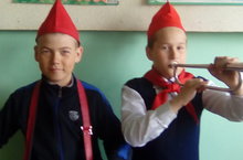 Ученики 4 класса представили первых пионеров с отрядным флагом,барабаном,в красных галстуках и в пилотках.Педагог-организатор рассказал детям историю возникновения пионерии.