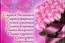 8 марта — день весенний. Зима уносит ноги прочь, Становятся длиннее тени, Быстрее день сменяет ночь. 8 Марта — женский праздник. Он полон радости, цветов, Сиянья нежных глаз прекрасных, Красивых и душевных слов.