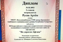С 15 февраля по 13 марта прошел III Всероссийский социально-патриотический конкурс, посвященный годовщине вывода советских войск из Афганистана "По дорогам Афгана". По итогам конкурса ученик 2А класса Большекайбицкой школы удостоился диплома I степени. Поздравляем!