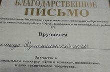 Сегодня учащиеся нашей школы Э. Ахметзянов, А. Фуфаев, И. Садриев, Е. Гурнович ( руководитель Ю. И. Дунаев) приняли участие в муниципальном конкурсе "Дети и техника", посвящённый дню технического творчества .