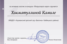 Бакчабызның кечкенәләр төркемендә тәрбияләнүче Хикматуллина Камиля Шамил кызы, тәрбияче Насретдинова Диләрә Марат кызы җитәкчелегендә, " Гаилә һәм мәктәп" журналы редакциясе КФУ белән берлектә бәйге игълан итте. Камиля бу бәйгедә катнашып Сертификат алды. Әфәрин , котлыйбыз!!!