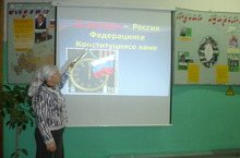 12 декабрь - Россия Конституциясен кабул итүгә 20 ел. Укучылар белән Конституциянең төп билгеләре, Россиянең символлары, әһәмияте турында педагог-организатор Сабирова Г.Х. әңгәмә үткәрде һәм презентация күрсәтте. Укучылар Конституция турында шактый мүгълүматлы булуларын күрсәттеләр һәм белемнәрен тулыландырдылар. Әңгәмә Россия Гимнын башкару белән тәмамланды.