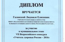 Учитель здоровья - 2016 09.01.2017 Классный руководитель 5 класса Галанская Л.Е. участвовала в 7 всероссийском конкурсе "Учитель здоровья - 2016" и удостоилась диплома за участие в муниципальном этапе.