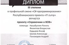 Наши учащиеся Насыбуллин Раниль и Филиппов Владислав с 17 по 23 апреля участвовали в профильной смене республиканского конкурса "С# - программирование" Республиканского проекта "IT - Jump". И заняли почетное 3 место за проект "Справочник о ВОВ". Привезли с собой сертификаты участников, дипломы 3 степени, благодарственное письмо Шиховой М.С. и школе за хороший уровень подготовки школьников и призовое место. Желаем ребятам дальнейших успехов!
