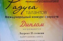 Радуга талантов 22.02.2022 Хайрутдинова А участвовала в международном конкурсе искусств "Радуга талантов" и удостоилось диплома 2 степени.