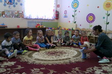 После длительных каникул начались первые занятия.В младшей группе кукла Алсу знакомится с воспитанниками и дети ей рассказывают,как они провели каникулы.