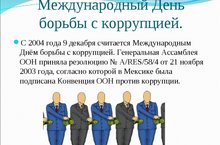 Коррупция — это проблема, которая касается абсолютно всех граждан страны. Мы все мечтаем о том, чтобы жить в государстве, где экономика находится на подъеме, каждый имеет право на выбор, законы исполняются неукоснительно и никто не может воспользоваться привилегированным положением. Но до тех пор, пока процветает коррупция, обо всех этих возможностях можно только мечтать. И это справедливо для большинства стран, потому и появился Международный день борьбы против коррупции. Каждый год его отмечают девятого декабря. Этот праздник специально придуман для того, чтобы привлечь к проблеме как можно больше внимания, заставить многих людей задуматься о будущем своей страны.