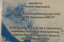 Благодарственное письмо подписанное председателем ТРО ВОД "Волонтеры Победы" под подписью А.А.Идрисова получила юнармеец Ангелина Савельева!