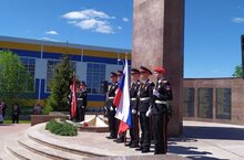 На площади перед мемориальным комплексом строевым маршем прошли победители и призеры районного конкурса строя и песни - учащиеся Большекайбицкой школы: члены военно-патритотического клуба «Подвиг», учащиеся восьмых и шестого классов.