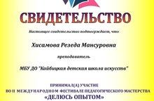 Есть такие преподаватели, которые преуспевают во многих областях своего дела. Они не только с удовольствием дают знания своим ученикам, демонстрируют мастер-классы, свои творческие способности и профессионализм, но и будучи наставником, делятся своим педагогическим мастерством в различных печатных изданиях. Одна из них - преподаватель фортепиано Хисамова Резеда Мансуровна. Она приняла участие во II Международном фестивале педагогического мастерства "ДЕЛЮСЬ ОПЫТОМ" с научно-методической работой на тему "В классе фортепианного ансамбля". Работа Хисамовой Р.М.вошла в сборник, где представлены индивидуальные и коллективные статьи педагогов, посвященные изучению и обобщению практики и опыта педагогической деятельности. Преподавателю вручили Свидетельство, подтверждающее участие в этом Международном фестивале. Коллеги поздравляют Резеду Мансуровну и желают ей дальнейших успехов и вдохновения!