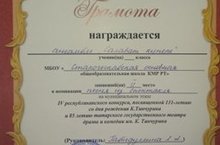 5 нче сыйныф укучысы Гирфанова Газизә Республикакүләм "Виртуальный мир глазами ребенка" исемендәге рәсемнәр конкурсының муниципаль этабында "Социаль челтәрләрдә мәгълүмати куркынычсызлык" номинациясендә 1 нче урынга лаек булды (җитәкчесе информатика укытучысы Э.Р.Гильманова). Газизәне әлеге уңышы белән котлыйбыз!