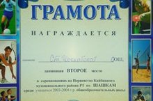 28 нче октябрь көнне, Кайбыч муниципаль районы гомумбелем бирү мәктәпләрендә укучы 2003-2004 нче елгы балалар арасында, район Беренчелегенә шашка ярышлары узды. Әлеге ярыштан 7 нче сыйныф укучылары Хәсәнов Баязит, Хөсәенова Илгизә, Шәмсетдинова Алия, 8 нче сыйныф укучысы Гаттаров Рамилне алган безнең мәктәп командасы 2 нче урын яулап кайтты. Укучыларны әлеге җиңүләре белән чын күңелдән котлыйбыз. Афәрин балалар!