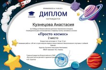 Поздравляем ученицу 5 класса Кузнецову Настю, занявшую 2 место во Всероссийском детском творческом конкурсе "Просто космос" и учителя Быченко Анастасию Николаевну, подготовившую Настю.