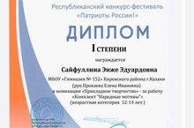 Поздравляем нашу ученицу Сайфуллину Энже, получившую диплом I степени в Республиканском конкурсе "Патриоты России" в номинации "прикладное искусство"!