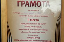 30 апреля прошел "Парад мальчишей" среди общеобразовательных учереждений Кировского и Московского районов, посвященный 74-й годовщине Победы в Великой Отечественной войне. Поздравляем наш отряд, как лучший отряд среди образовательных учереждений.