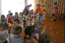 У наших малышей весь день хорошее настроение, потому, что к нам с самого утра пришли забавные гости: Кнопочка и Веселинка. Они показали детям настоящие фокусы, рассказали смешные стихотворения, выдули волшебные мыльные пузыри.