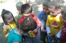 Эти очаровательные хрюшки появились на прогулочном участке детей раннего возраста. Конечно, малышам, при расставании с родителями, капризничать некогда, - надо накормить поросят!