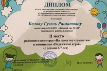 Поздравляем Белову Г.Р., занявшую 2 место в районном конкурсе "На прогулку с радостью" в номинации "Подвижные игры" (сдетьми 6-7 лет)