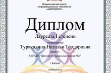 ПОЗДРАВЛЯЕМ ТУРАКАЛИНУ НАТАЛЬЮ ТЕОДОРОВНУ Всероссийский конкурс для педагогов "ИНТЕЛЛЕКТ" - Лауреат 1