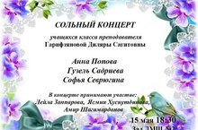 15 МАЯ в 18-30 в концертном зале музыкальной школы состоится сольный концерт ПОПОВОЙ АННЫ, САДРИЕВОЙ ГУЗЕЛЬ и СЕВРЮГИНОЙ СОФЬИ. В мероприятии принимают участие: ЗАППАРОВА ЛЕЙЛА, ЯСМИН ХУСНУТДИНОВА (класс преподавателя ГАРИФЗЯНОВОЙ ДИЛЯРЫ САГИТОВНЫ) и АМИР ШАГИМАРДАНОВ (класс профессора Казанской государственной консерватории им. Н.Жиганова С.Л.ФЕДОСЕЕВОЙ). Приглашаются все желающие!!!