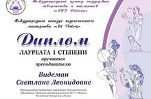 ПОЗДРАВЛЯЕМ ПОБЕДИТЕЛЯ Международного конкурса педагогического мастерства "Art Victory" ВИДЕМАН СВЕТЛАНУ ЛЕОНИДОВНУ - ЛАУРЕАТ 1 СТЕПЕНИ.