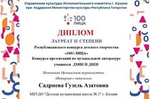 ПОЗДРАВЛЯЕМ ПОБЕДИТЕЛЯ Республиканского конкурса детского творчества "100//ЛИЦА", Конкурса презентаций по музыкальной литературе учащихся ДМШ САГИТОВА ГУЗЕЛЬ - ЛАУРЕАТ 2 СТЕПЕНИ.
