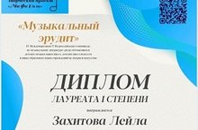 Поздравляем победителя IV Всероссийской (V Международной) олимпиады по музыкальной литературе среди обучающихся детских музыкальных школ, детских школ искусств и иных образовательных учреждений культуры и искусства "Музыкальный эрудит" ЗАХИТОВА ЛЕЙЛА" - Лауреат1. Класс преподавателя Сабитовой Галины Васильевны. Поздравляем!!!