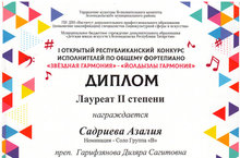 ПОЗДРАВЛЯЕМ ЛАУРЕАТА I ОТКРЫТОГО РЕСПУБЛИКАНСКОГО КОНКУРСА ПО ОБЩЕМУ ФОРТЕПИАНО "ЗВЁЗДНАЯ ГАРМОНИЯ" 26.03.2018