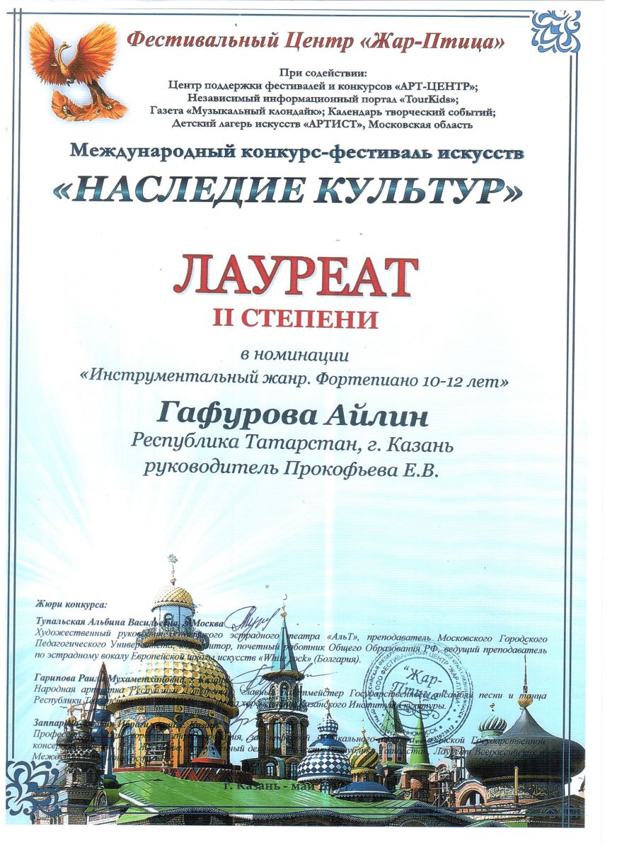Гафурову Айлин, с присвоением звания ЛАУРЕАТ II СТЕПЕНИ, класс преподавателя Е.В.Прокофьевой