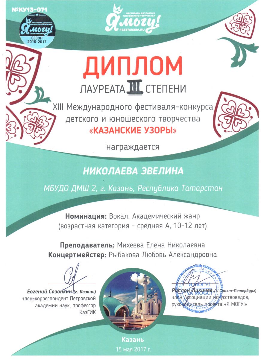 Николаеву Эвелину, с присвоением звания ЛАУРЕАТ III СТЕПЕНИ, класс преподавателя Е.Н.Михеевой, концертмейтер Л.А.Рыбакова