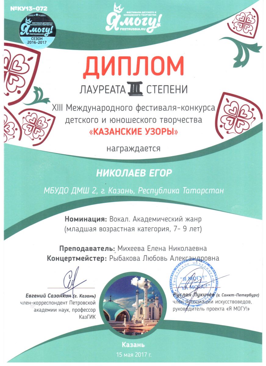 Николаева Егора, с присвоением звания ЛАУРЕАТ III СТЕПЕНИ, класс преподавателя Е.Н.Михеевой, концертмейтер Л.А.Рыбакова
