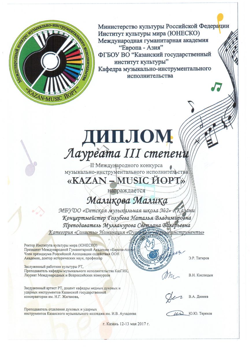 Маликову Малику, с присвоением звания ЛАУРЕАТ III СТЕПЕНИ, класс преподавателя С.В.Муллануровой, концертмейстер Н.В.Голубева