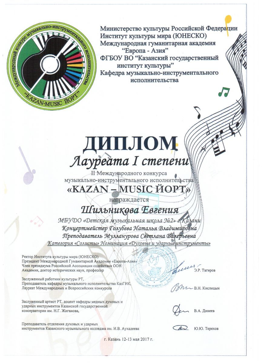 Шильникову Евгению, с присвоением звания ЛАУРЕАТ I СТЕПЕНИ, класс преподавателя С.В.Муллануровой, концертмейстер Н.В.Голубева